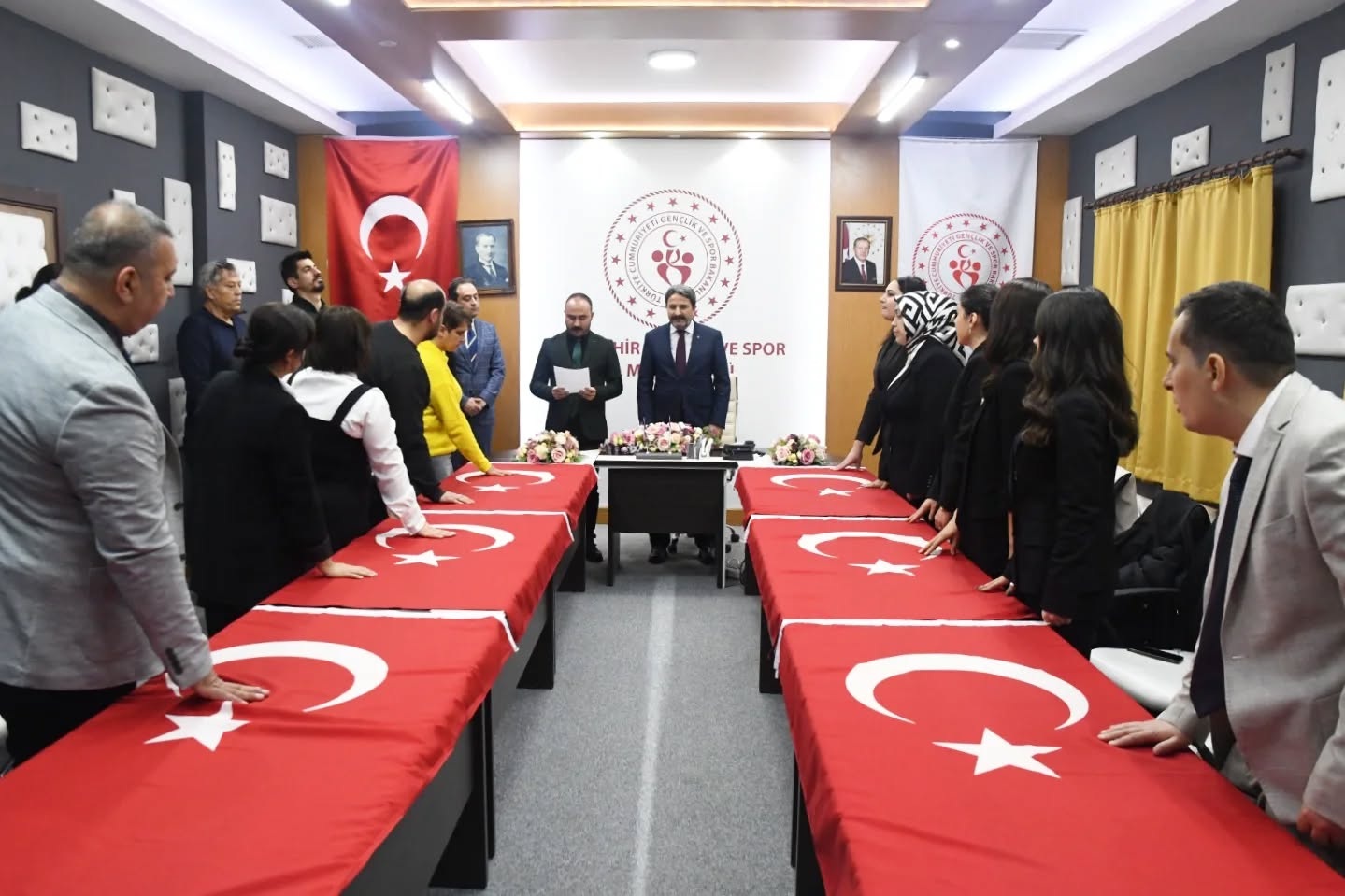 Gençlik ve Spor İl Müdürlüğünden verilen bilgiye göre, söz konusu kurumda, 3 hizmet yılını tamamlayan personeller, sözleşmeli statüden kadroya geçti. İlk grupta yer alan personelin kadroya geçişleri için yemin töreni düzenlendi. Gençlik ve Spor İl Müdürü Hasan Kalın’ın katılımıyla kurum binasında yapılan yemin töreni için masaların üzerine büyük Türk Bayrağı serildi. Sonra kadroya geçen personeller sağ ellerini Türk Bayrağının üzerine koyarak yemin etti.