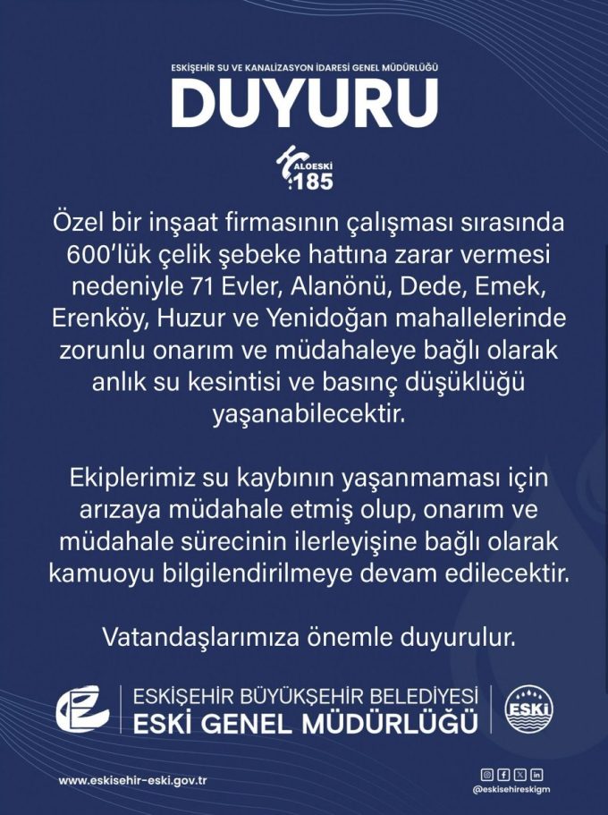 ESKİ; ODUNPAZARINDA 7 MAHALLEDE SU KESİNTİSİ VAR